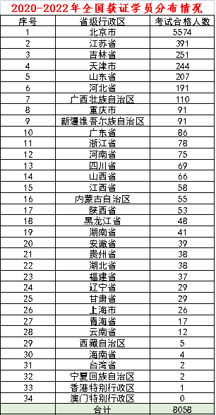 2020-2022年全国初级社会心理指导师统计分布图