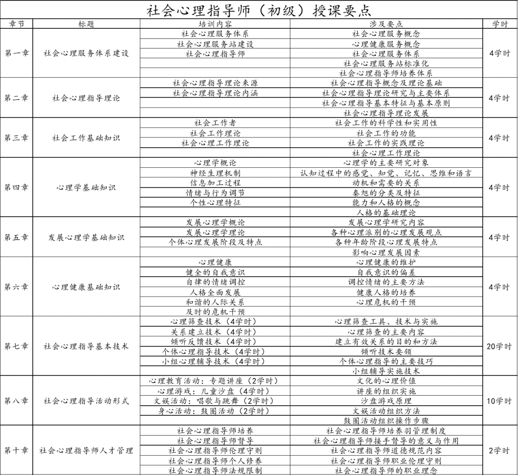 2、教材与教学《社会心理指导师》教材由北京市社会心理工作联合会主编,国家行政管理出版社出版;初级教学采取线上培训方式,共计56学时。